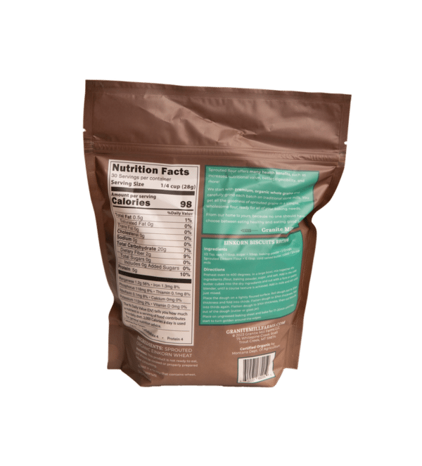 All of our flour is whole grain, USDA organic, and GMO free. It is ground in small batches on a traditional stone mill. Choose between Sprouted or Natural (unsprouted).